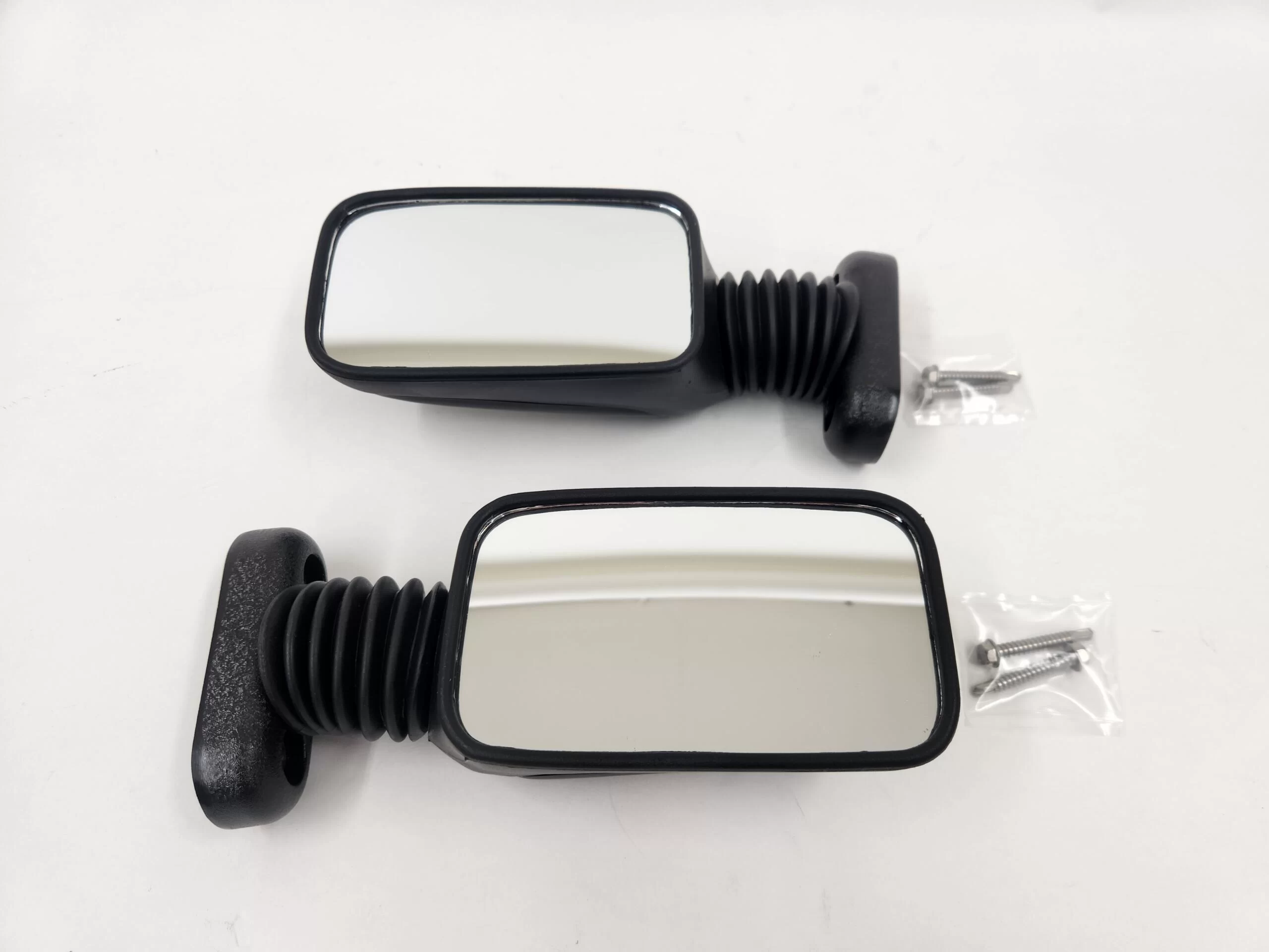 GEM Car Side Mirror Set of two mirrors that can be easily installed on the A-pillars of your GEM.  Self-tapping stainless steel screws included for easy installation.  These mirrors are manually adjusted.  These heavy duty side mirrors have a metal base and stem.