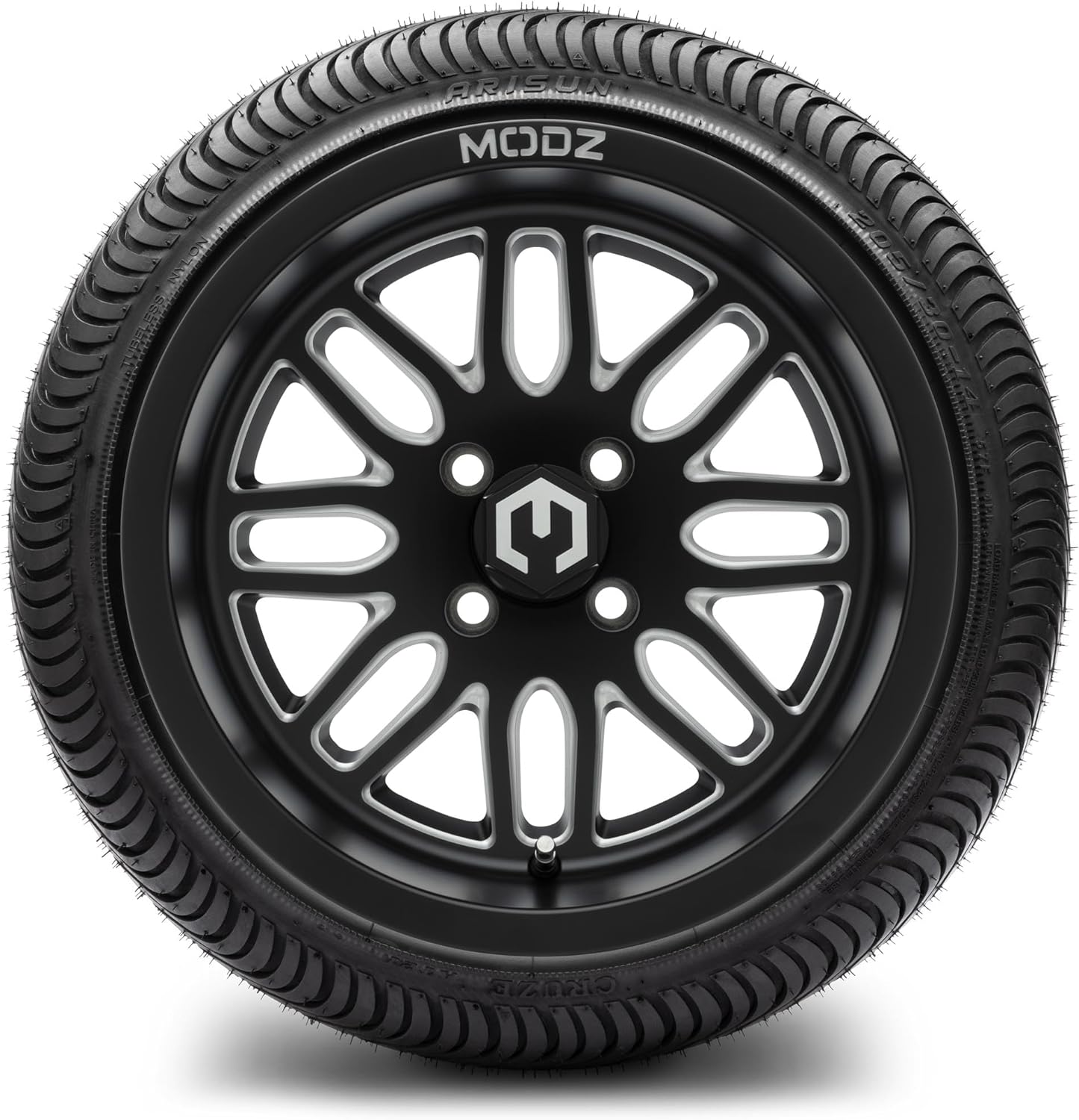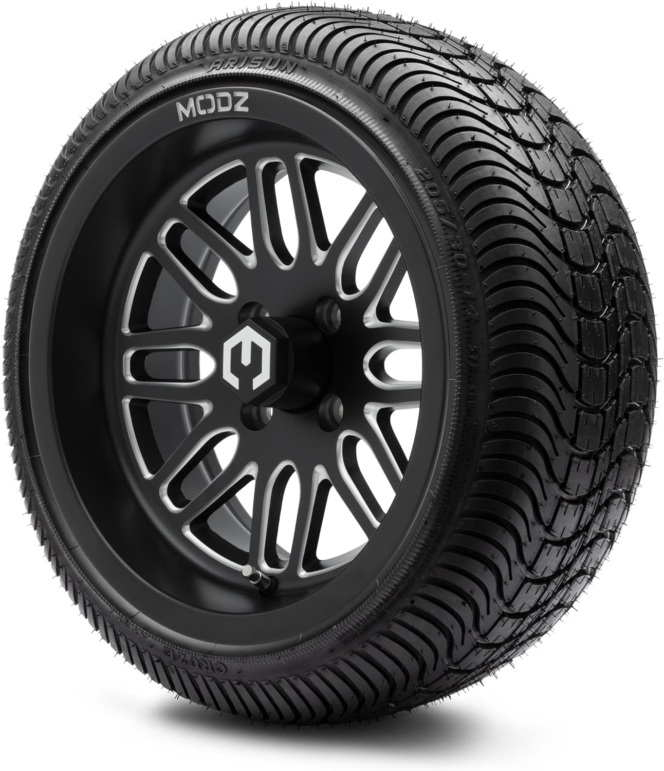 MODZ® Mayhem Glossy/Matte Black Ball Mill 14″ Golf Cart Wheels and Arisun Cruze (205/30-14) Low Profile DOT Golf Cart Tires Combo – Set of 4