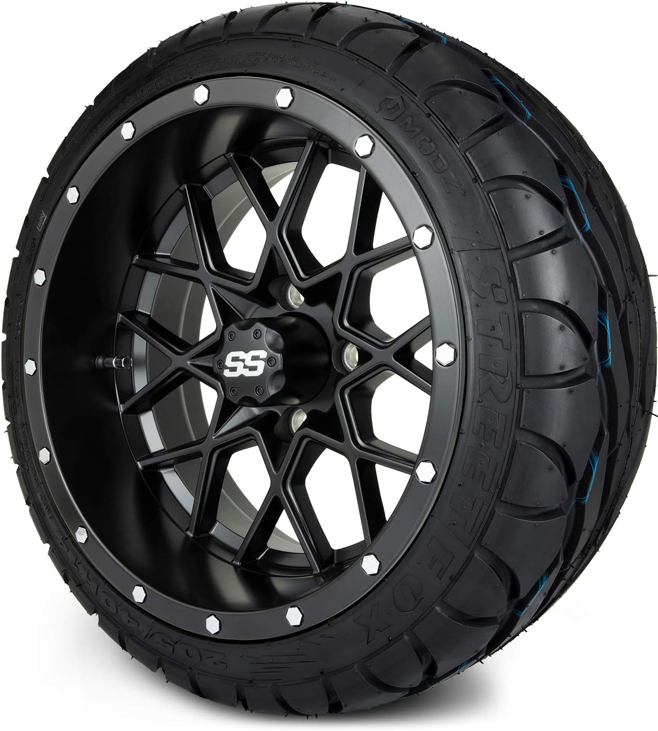 MODZ® Vortex Glossy/Matte Black 14″ Golf Cart Wheels and Tires (Street Fox) Combo – Set of 4